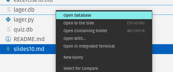 connection.close()🎬 Führen Sie das Programm lager.py aus. Es wird nun eine lager.db Datei erstellt.