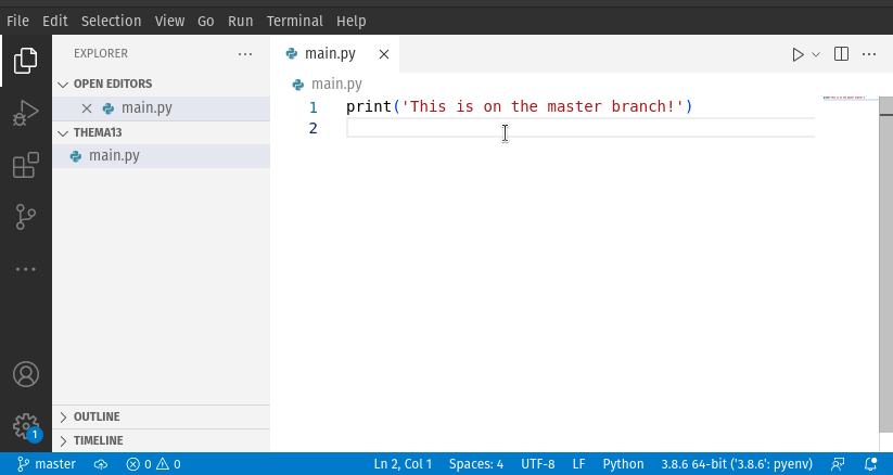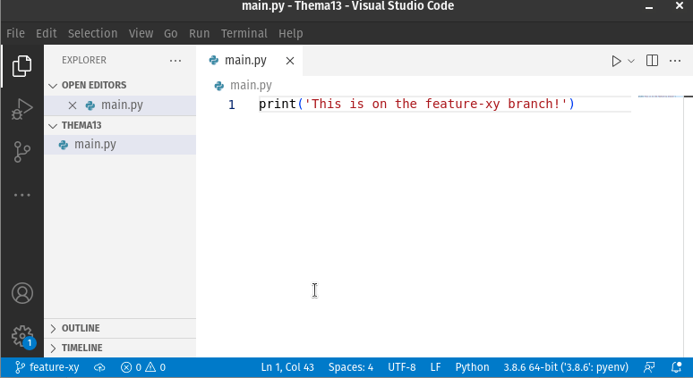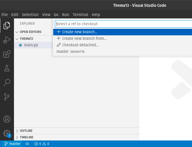🎬 Klicken in VSCode unten links auf master und im neuen Dialog wählen Sie Create new branch.... Geben Sie als Bezeichnung feature-xy.