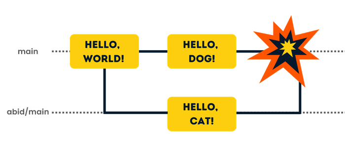 Wenn Sie auf unterschiedlichen Branches auf der gleichen Zeile in einer Datei eine Änderungen machen, comitten und anschliessend den einen Branch in den anderen mergen wollen, wird eine Konflikt entstehen.