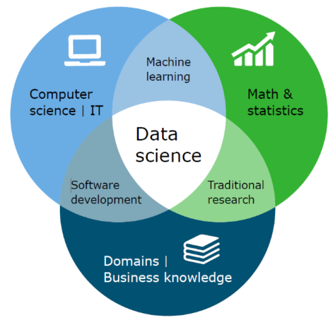 Datenwissenschaft (Data Science) ist ein interdisplinäres Fachgebiet zwischen Informatik, Mathematik und einer weiteren Domäne (Biologie, Medizin, Elektronik).