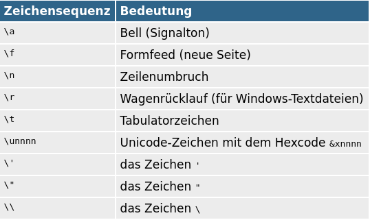 Sonderzeichen können mit Escape-Sequenzen eingebettet werden.