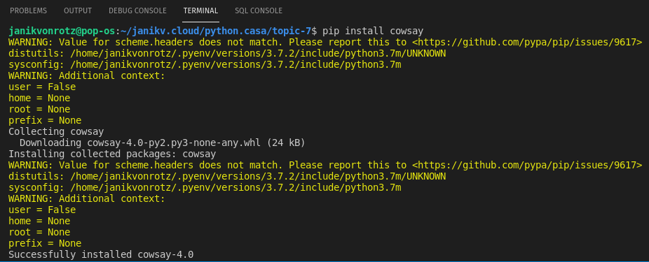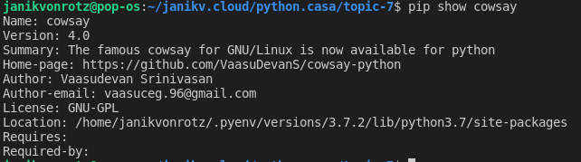 Wo Pakete von pip instaliert werden, kann je nach Entwicklungsumgebung unterschiedlich sein. Mit dem Befehl pip show cowsay zeigt pip wo genau das Paket installiert wurde.